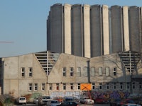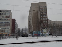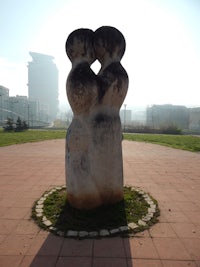 An unnamed sculpture that survived the war. Smog is a winter constant.